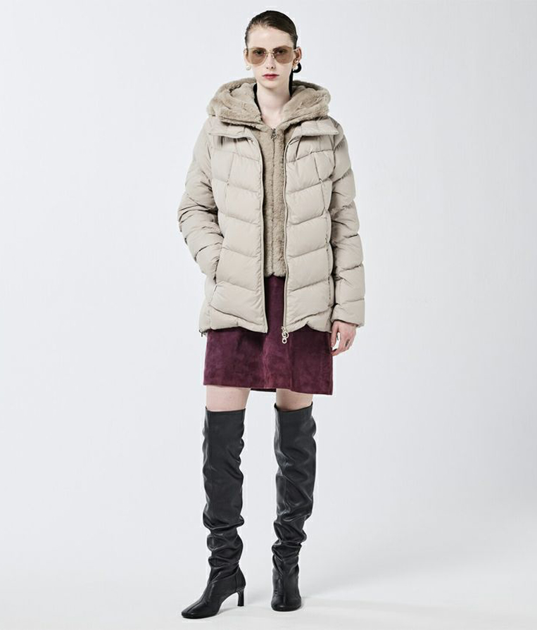定番のセミロングダウンに、人気のエコファーとマット素材を組み合わせた上品なコンビネーションモデル。