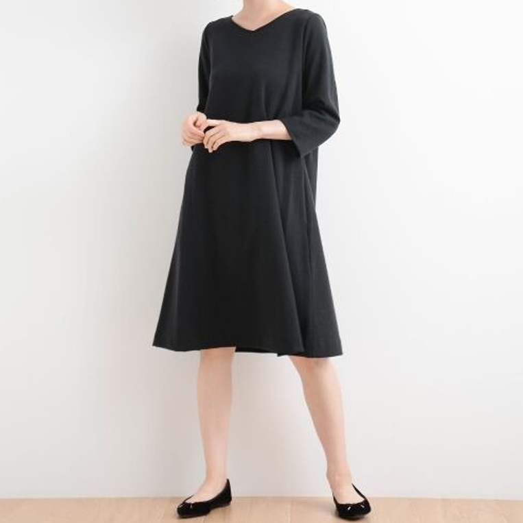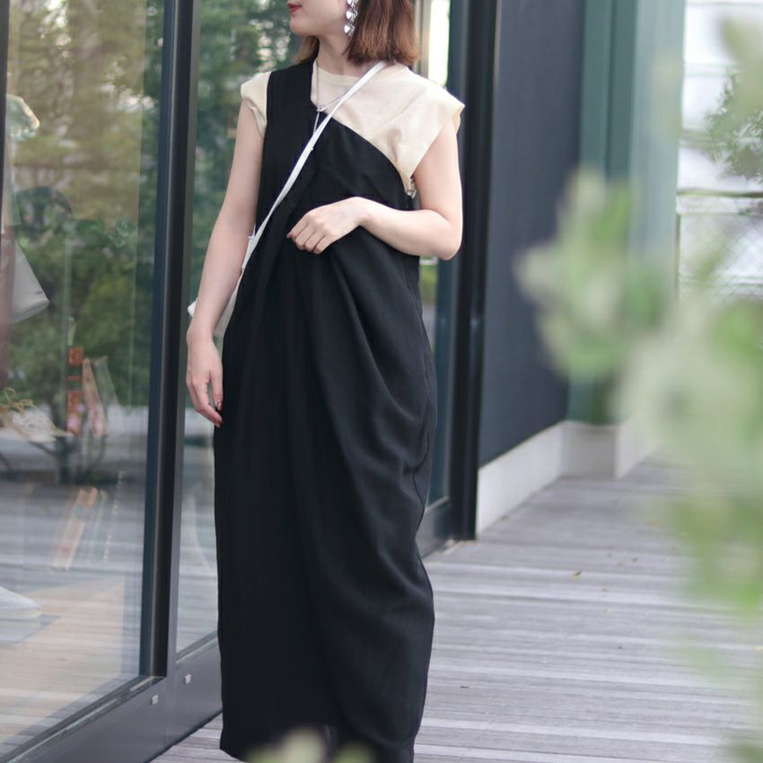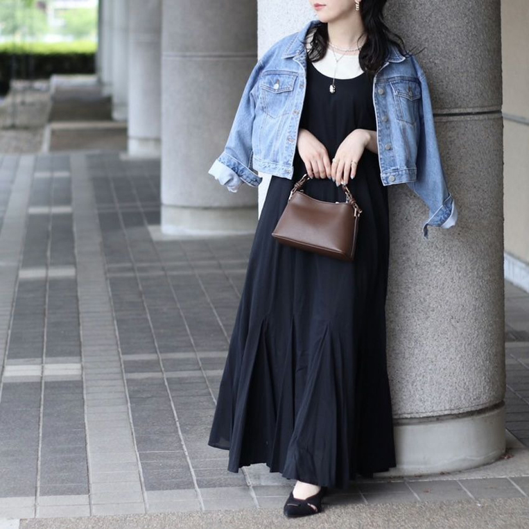 暗めカラーのワンピースも、足首が見える丈感や明るめのパンツ・インナーなどを合わせることで、重たくならず抜け感のある印象に◎