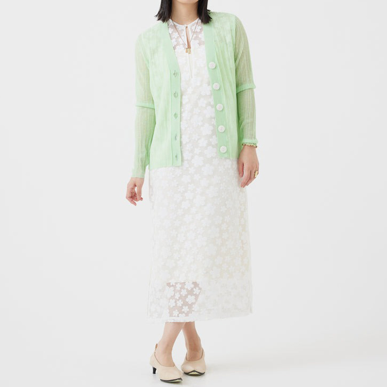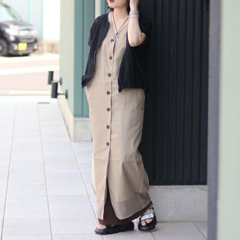 ワンピース一枚ではやや物足りなさを感じるときは、ジャケットやカーディガンなどを羽織ることで、コーディネートに奥行きが生まれます。
