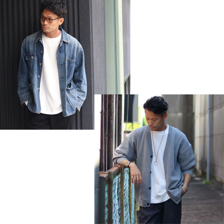 ジャケットやカーディガンの下に無地Tを合わせると、シンプルながらも奥行きのあるコーデに仕上がります。