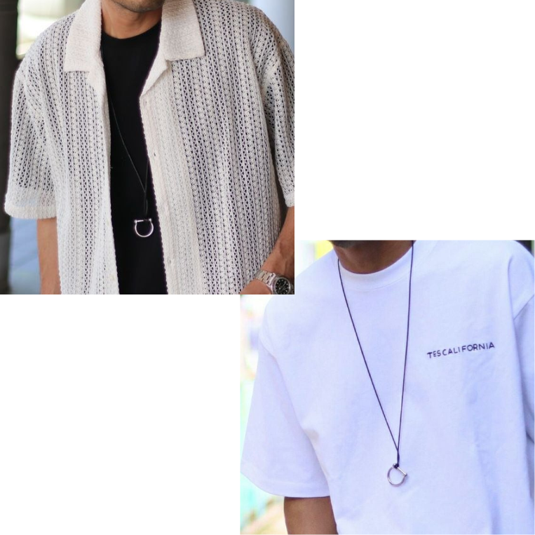 無段階で長さを調整できるため、Tシャツのネックラインやスタイリングに合わせて自由にアレンジが可能。
