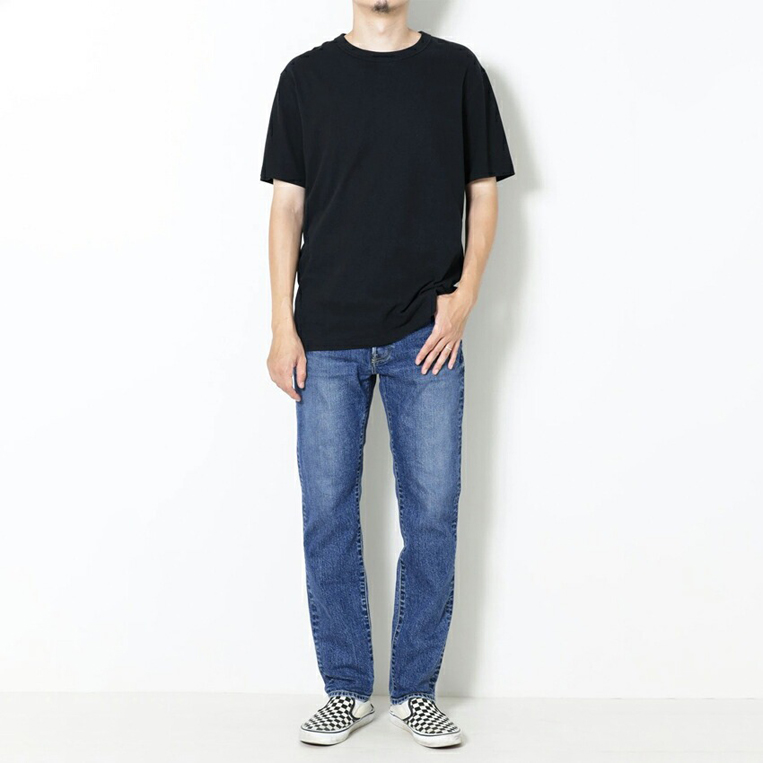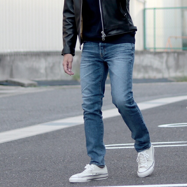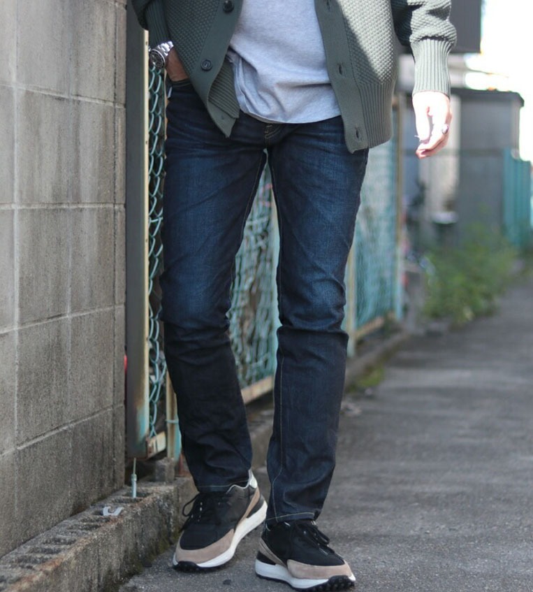 若い人が履く細身のデニムのようなピタピタ感もなく、大人の男性にもおすすめできるすっきりとしたシルエットで履きこなすことができます。