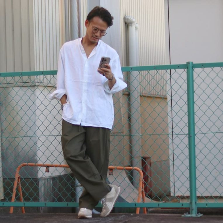 オーバーサイズのシャツにカーキのスラックスで、丁度良くコーデが中和されています。